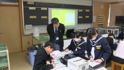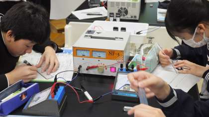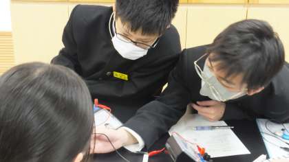 2月6日(火)2年 授業風景 公開日 2024/02/06 更新日 2024/02/06 2年生 2−2理科の様子です。 「抵抗器に加える電圧を変化させたときの抵抗器に流れる電流の大きさを測定し、電圧と電流の関係を調べよう」 班で確認し合いながら数値を読み取っています。