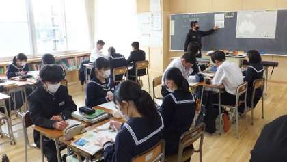 3月4日(月)1年 授業風景 公開日 2024/03/04 更新日 2024/03/04 1年生 1−1社会の様子です。 オセアニア州の気候について学習しています。 グループになり、資料集や地図の情報をワークシートに書き込んでいきます。