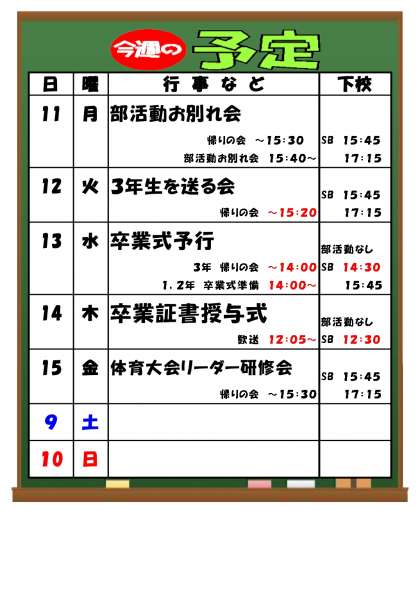 3月11日(月)〜 今週の予定 公開日 2024/03/08 更新日 2024/03/08 お知らせ※2024以前 いよいよ卒業式の週となりました。 感動的な卒業式となるよう、それぞれの立場でベストを尽くしましょう。