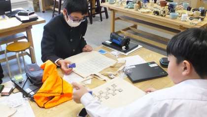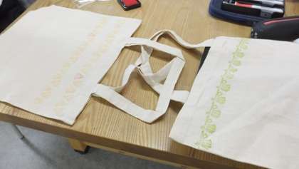 3月11日(月)1年 授業風景 公開日 2024/03/11 更新日 2024/03/11 1年生 1−2美術の様子です。 自分でデザインした文様を消しゴムはんこにして、エコバッグに押しています。 自分だけの「文様バッグ」が完成しました。