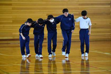 中:1組 サビの振り付けです。肩を組んでステップを踏んでいます。