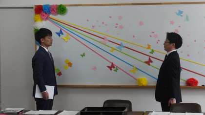 4月1日(月)令和6年度が始まりました 公開日 2024/04/01 更新日 2024/04/01 お知らせ※2024以前 新たなメンバーが加わり、新体制で令和6年度の上滝中学校が動き出しました。 職員会議に先立ち、教職員一同が見守るなか、今年度新規採用となって本校に着任した教員が宣誓を行いました。 本県では新規採用ですが、他県での教職経験があるということで、即戦力と期待しています!