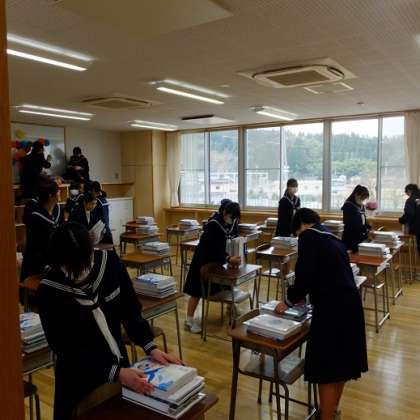 新入生教室の準備です。手際よく教科書を確認しています。飾り付けも華やかです。