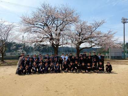 桜の花が咲きはじめた校庭で、学年みんなで集合写真を撮影しました。