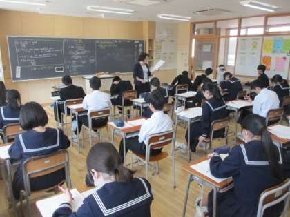 4月12日(金)2年 授業風景 公開日 2024/04/12 更新日 2024/04/12 2年生 2−1理科 「ホットケーキの膨らむ仕組みについて考えよう」 2−2英語 中教研学力調査の答案が返却され、解説を聞いています。
