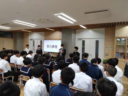 5月1日(水)3年 学年集会 公開日 2024/05/01 更新日 2024/05/01 3年生 本日、3年生は学年集会を行いました。これまで忙しい中、学年プログラム委員が考えてくれた、学年目標と学級目標の発表を行いました。学年目標は『有終の美』、1組学級目標は『努力夢限』、2組学年目標は『DIAMOND〜31で1つのリング〜』となりました。 それぞれの目標を達成できるよう、常日頃から目標を意識して活動していきたいと思います。