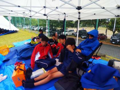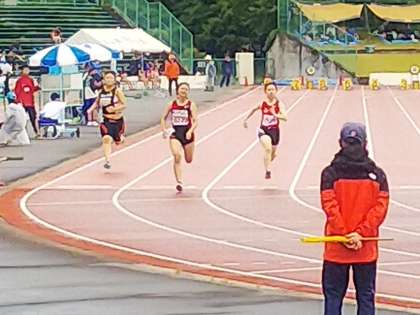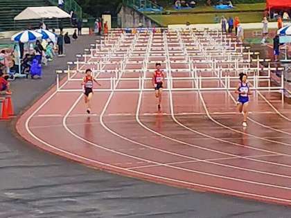五福陸上競技場で行われている市民体育大会陸上競技2日目。時折雨が降るあいにくのコンディションの中、本校生徒たちは今日も健闘しています。写真は、共通男子110mH、3年女子100m、そして応援する控え場所の様子です。