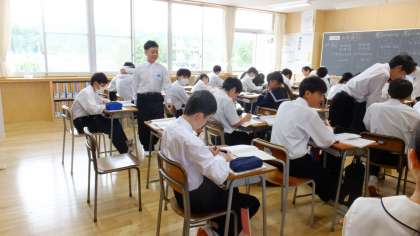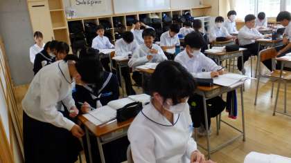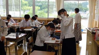 1−1数学の様子です。 負の数を含んだ割り算について、学習のまとめとして練習問題に取り組んでいます。