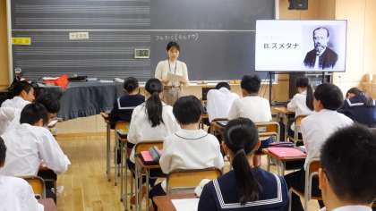 6月4日(火)3年 授業風景 公開日 2024/06/04 更新日 2024/06/04 3年生 3−1音楽の様子です。 B.スメタナの「ブルタバ」を学習する前に、作曲者の人生や当時の時代背景等について確認しています。