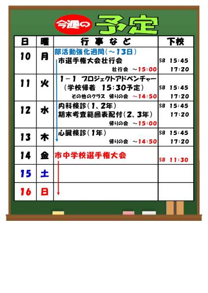 6月10日(月)〜 今週の予定 公開日 2024/06/08 更新日 2024/06/08 お知らせ※2024以前 週末はいよいよ市中学校選手権大会です。 万全の状態で大会に臨めるよう、「早寝、早起き、朝ご飯」を心がけましょう。
