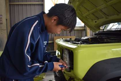仁平では、午前中に洗車を行いました。また、写真は、お客様の車を整備している様子です。真剣な表情で車の部品を取り付けていました。