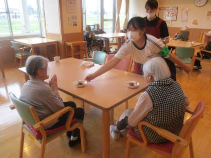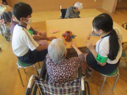 午前中はドライヤーなど入浴のお手伝いを行い、午後からはレクリエーションを一緒に楽しみました。初日から利用者の方々と関わらせてもらい、少し緊張した様子も見られましたが、「来てくれてうらしい」「やさしいね」と温かい声をかけていただくと笑顔が見られ、和やかな雰囲気で頑張っていました。(保護者ボランティアの方が作成)