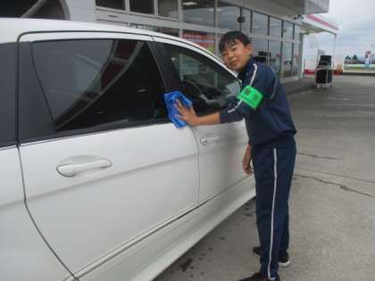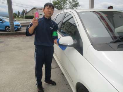 暑い中、洗車後の吹き上げを黙々と行っていました。一人ですが、立派に働いています。ここで学んだ技術を生かし、今度は自分の家の車も洗ってみてね。