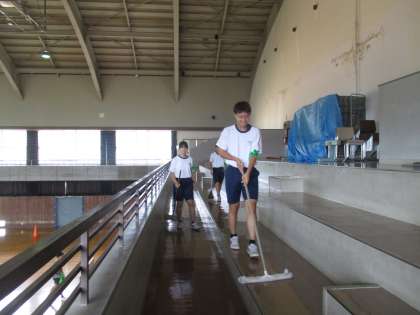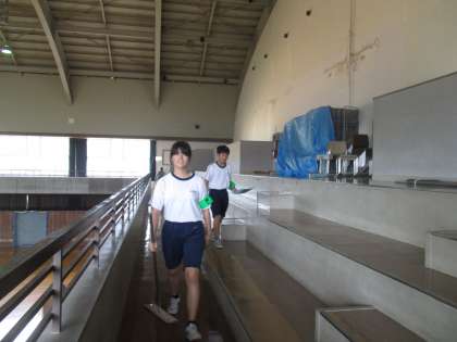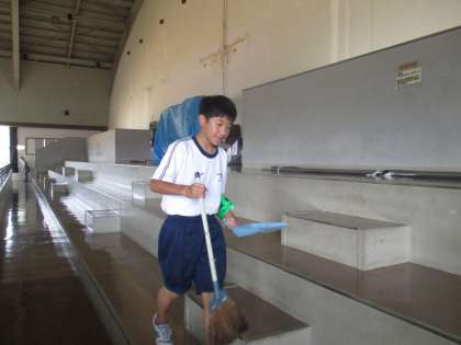 昨日は休業日のため今日が初日となります。午前中は施設の清掃、午後は事務仕事を行いました。3人で分担し、清掃職員さんの指示に従ってゴミやほこりがないように丁寧に行っていました。社体での体育の授業の妨げにならないよう順番を考え、静かに活動していました。授業後には体育館の角まで清掃し、次の授業に気持ちよく入れるようにしていました。事業所の方々には、素直でかわいらしい生徒たちと言っていただけました。(保護者ボランティアの方が作成)