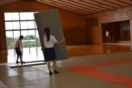 7月3日(水)2年 社会に学ぶ「14歳の挑戦」 大山総合体育センター 公開日 2024/07/03 更新日 2024/07/03 2年生 昨日格技室の畳を取り外し、床を掃除したので、今日は取り外した畳を入れる活動をしていました。全部で288枚もの畳を運び、決められた場所に入れていました。 学校では、柔道の授業で使わせていただいている場所がこのような手間を掛けて掃除をしていることに驚きながらも、一生懸命に活動していました。