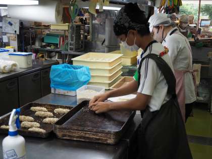 ピーナッツパンにピーナッツを均一にまぶすという調理パンの製造を黙々とこなしていました。(写真 上)