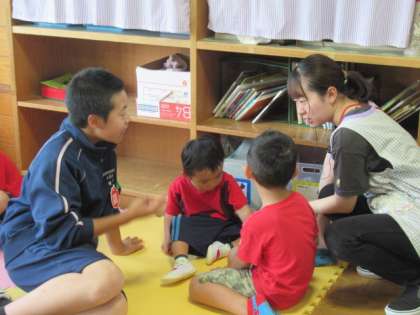 「同じくらいの年齢の弟がいるので、楽しい」という言葉が聞けたり、けんかになりそうな子どもたちをやんわり仲裁する頼もしい姿も見られました。また、「寝かしつけが上手!」と褒められている生徒も。
