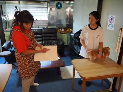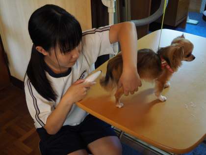 チワワの足裏(肉球まわり)のトリミングに挑戦!小型犬用の小さなバリカンを使って、どの向きならうまくトリミングできるか?犬の疲労具合はどうか?など注意しながら悪戦苦闘していました。12分かかりましたが、プロなら4分だそうです。でも初めてにしては上出来です。犬に声をかけながら優しく作業していたのが印象的でした。(保護者ボランティアの方が作成)