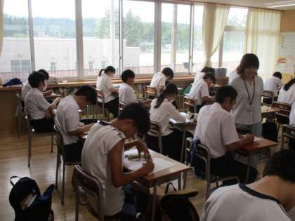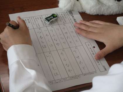 3−1国語の様子です。 硬筆で行書の練習をしています。 手本を見ながら、集中して書いています。