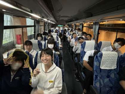 1組です。バスで出発を待っています。悪天候ですが、みんな元気です。これから海遊館へ向かいます!