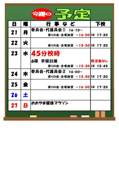 10月21日(月)〜 今週の予定 公開日 2024/10/18 更新日 2024/10/18 お知らせ※2024以前 今週も合唱練習が続きます。 水曜日のみ45分校時6限運行のため、下校時刻が変則的です。ご注意ください。