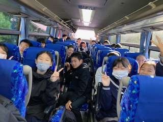 2年生は予定通り、バスに乗って金沢に向かって出発しました。 朝から生徒たちは元気いっぱいです。