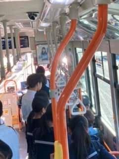 大きな街でバスに乗り、学んできた公共のマナーを実践中です。