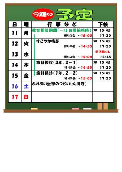 11月11日(月)〜 今週の予定 公開日 2024/11/08 更新日 2024/11/13 お知らせ※2024以前 今週は教育相談期間で45分校時です。 火曜日にすこやか検診、木・金曜日に歯科検診があります。