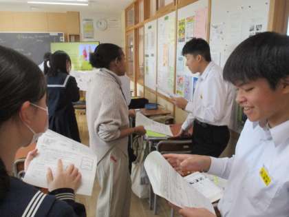 11月14日(木)3年 授業風景 公開日 2024/11/14 更新日 2024/11/14 3年生 3−2英語の様子です。 今日はALTの先生との授業です。 駅前で困っている外国人の方を助けてあげる、という想定でやりとりしています。