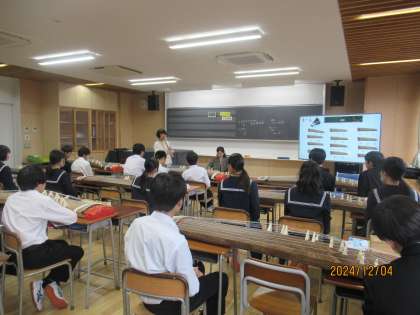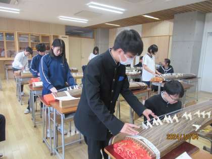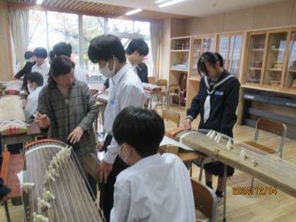 12月4日(水)1年 授業風景 公開日 2024/12/04 更新日 2024/12/04 1年生 1年音楽の授業の様子です。 昨年度に引き続き、生田流箏曲師範の西田先生にお越しいただき、箏の授業を行っています。 生徒たちはアドバイスを聞きながら、熱心に取り組んでいました。