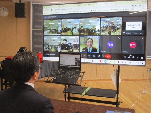 1月8日(水)3学期始業式 公開日 2025/01/08 更新日 2025/01/08 学校生活 3学期始業式を、特別教室からのオンライン配信でおこないました。式辞では、目的に向かって頑張るためには「自ら考える」ことが大切である、と呼びかけられました。