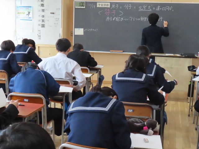 4月18日(金)2年生「授業のようす」 公開日 2025/04/18 更新日 2025/04/18 2年生 (写真上)1組保体「50m走」(写真中)2組理科「原子と分子と化学式の違いは何か?」(写真下) 〃