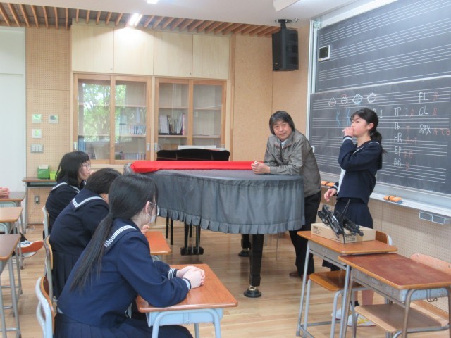 5月8日(木)吹奏楽部「部活動のようす」 公開日 2025/05/08 更新日 2025/05/08 部活動 楽器店の方が来校され、1年生が音楽の知識や楽器の吹き方について教えてもらいました。生徒たちは、熱心に話を聞いていました。