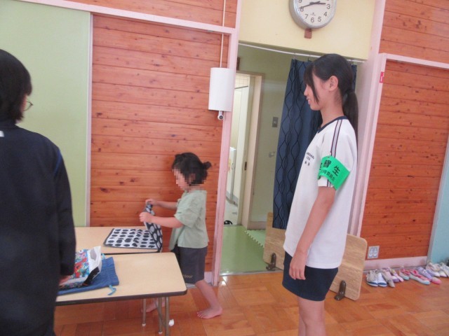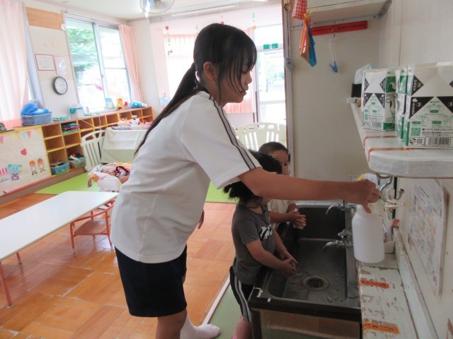 園児たちの着替えや手洗いを手伝ったり、一緒に手遊びをしたり、子どもたちと打ち解けられるように積極的に関わっていました。事業所にも、「元気に活動してくれている。」と言っていただきました。