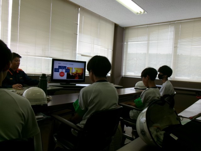 7月9日(水)2年生「14歳の挑戦 消防署」 公開日 2025/07/10 更新日 2025/07/10 2年生 午前中は座学で、出動以外にも査察業務(パソコン等)があることを学んでいました。消防の仕事は、火を消したり人の救助や手当をしたりするだけではないということを、クイズ形式で学んでいました。火事にならないように、自分たちができることを考えるよい機会になっていたようです。(保護者ボランティアの方より)