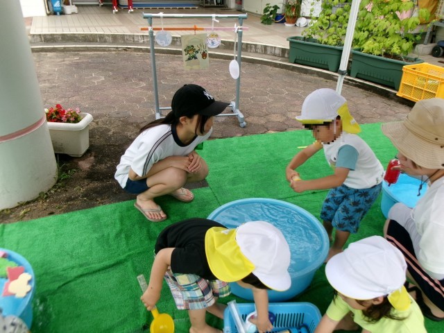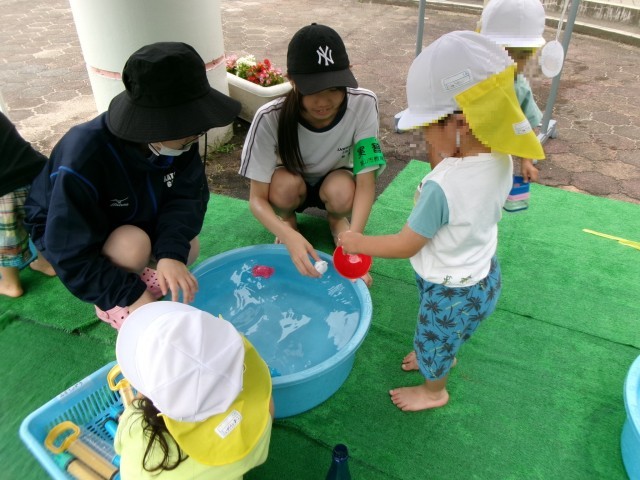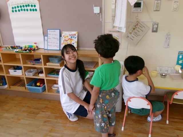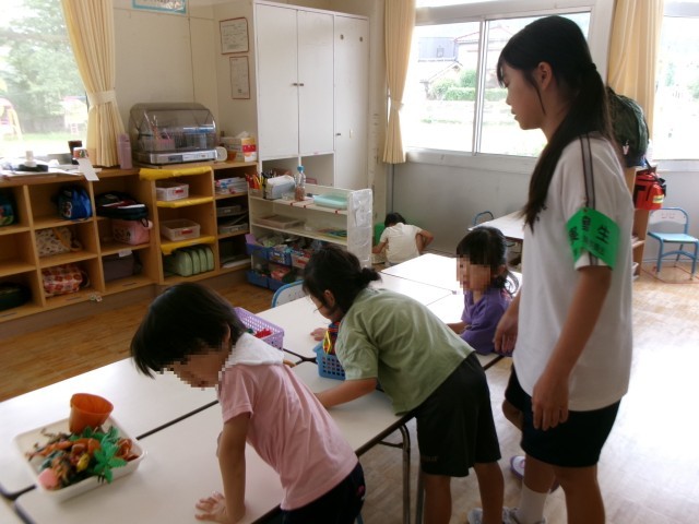 7月10日(木)2年生「14歳の挑戦 大山中央保育所」 公開日 2025/07/10 更新日 2025/07/10 2年生 子どもたちと目線を合わせて、優しく話しかけていました。保育所での仕事にも慣れてきたようで、子ども達と楽しそうに関わり、手助けをしていました。指導ボランティアの方にも「笑顔が素敵で、何か仕事を頼んでも『はい!』と笑顔で返事をしてくれます。」と言っていただきました。(保護者ボランティアの方より) +1