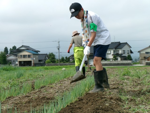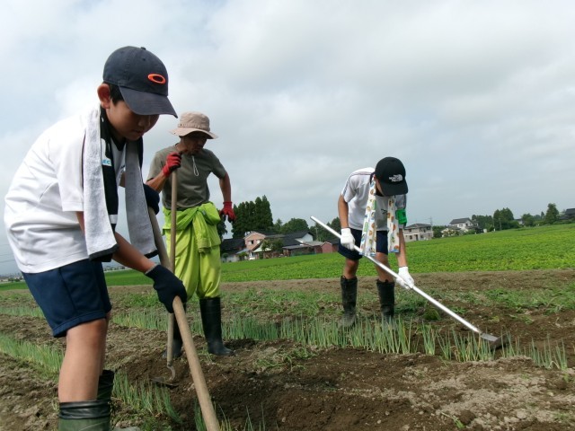 7月10日(木)2年生「14歳の挑戦 営農ワイエムアイ」 公開日 2025/07/10 更新日 2025/07/10 2年生 ねぎ畑の除草とねぎの白い部分に土をかける作業をしていました。土をかけるときは「三角ホー」という農具を使っていました。慣れない生徒たちは、苦戦していましたが、徐々にコツを掴んでできるようになり、指導ボランティアの方から「上手になってきたね。」とお褒めの言葉をいただきました。(保護者ボランティアの方より)