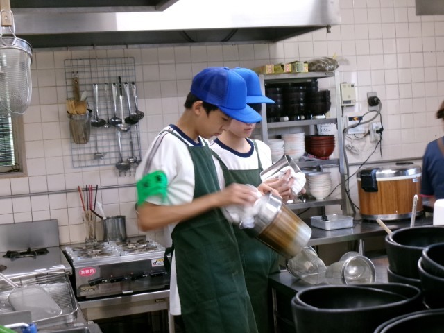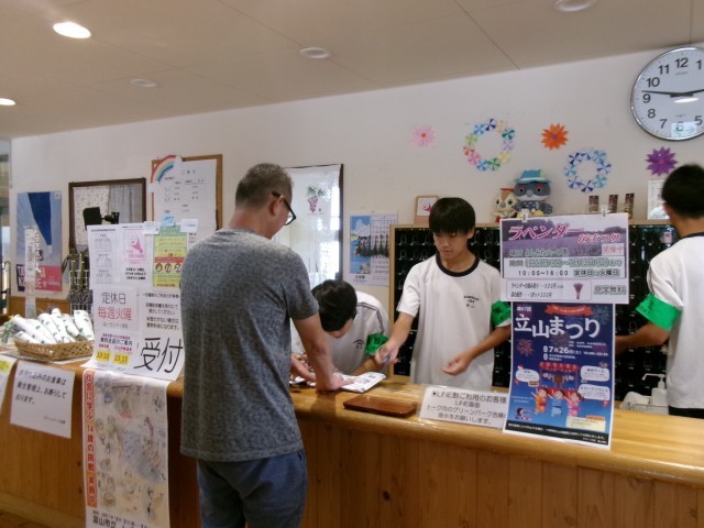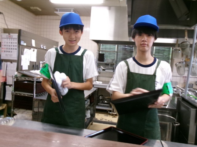 7月10日(木)2年生「14歳の挑戦 グリーンパーク吉峰」 公開日 2025/07/10 更新日 2025/07/10 2年生 入浴の受付と厨房の2か所に分かれて活動していました。入浴受付は一度にたくさんのお客様が来店した時が大変で、クーポン券などを持参されると頭が混乱すると言っていました。厨房は出来た物を間違えないようにおぼんに乗せる事に注意したようです。事業所の方は「声もしっかり出ているし、素直でいい子たちばかり」とおっしゃって下さいました。(保護者ボランティアの方より) +1