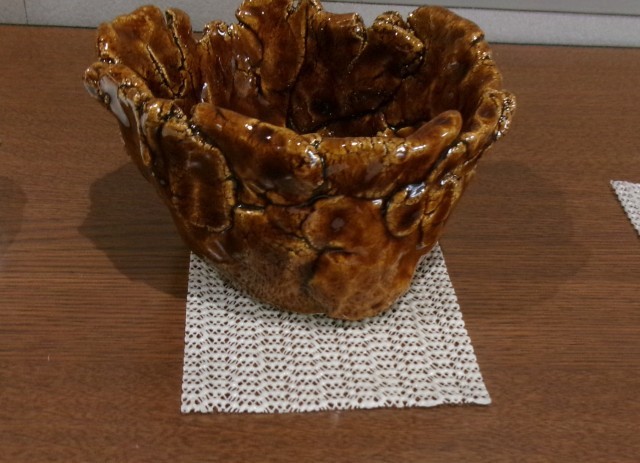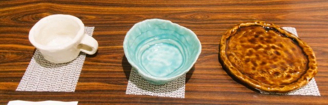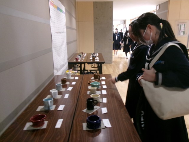 1年生の陶芸の授業の作品です。少しゆがんでいたり、指のあとが残っていたり、それが、「味」となって素敵な作品に仕上がりました。不揃いな形が一番の魅力です。