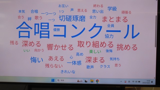 (写真上)1組学活「合唱コンクールのスローガン決め」