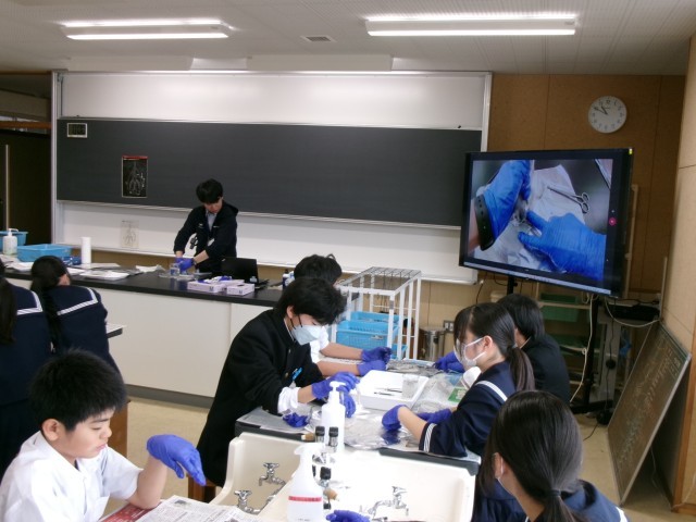 2年生の理科では、以前学習したヒトの心臓のつくりとはたらきを確認するために、ヒトの心臓に近いブタの心臓を用いて観察・解剖を行いました。