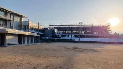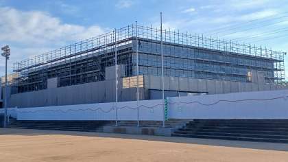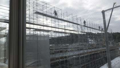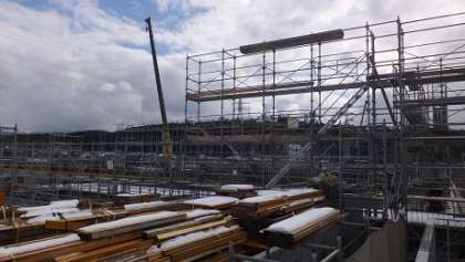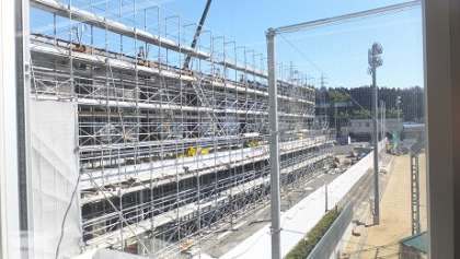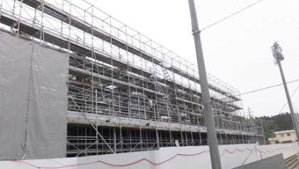 屋根の部分まで骨組みが組み上がり、アリーナ部分は足場と型枠で覆われています。