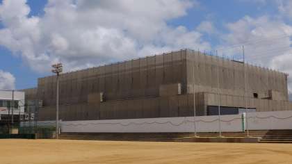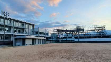 体育館全体にシートが掛けられ、中の様子はよく分かりませんが、毎日工事の音が響いています。