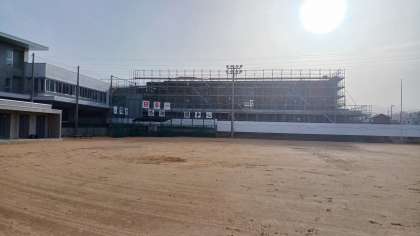 外壁を覆っていたシートが外され、ついに新体育館の外観が見えてきました!