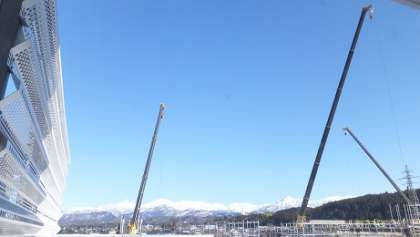高々と伸びたクレーンの向こうには、立山連峰が輝きます。 -