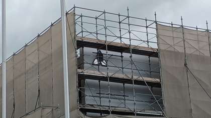 まだ全体がシートに覆われていますが、一部シートが外されたところから校章が見えてきました!