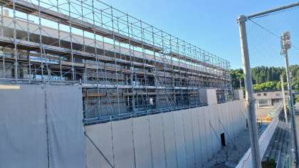 建物の1階部分を覆っていた足場が全て外されて、いよいよ新体育館が姿を現しました。