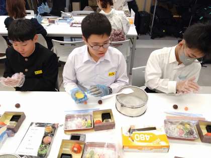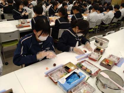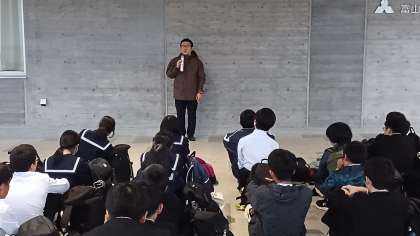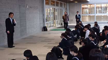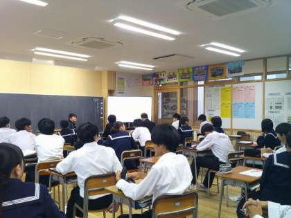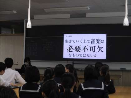 各クラスの代表者が、学年全員の前で発表しました。緊張しながらも、みんなが楽しく興味をもって聞けるように工夫しながら発表してくれました。聞いている生徒も、代表者が仕上げた大作を感心しながら聞いていました。 -