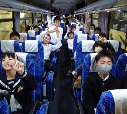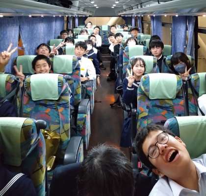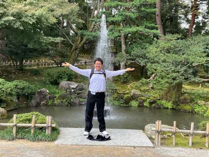 結団式での校長先生のお話にあった、兼六園 日本最古の噴水の前です。満面の笑顔ですね。