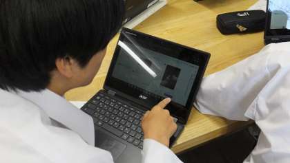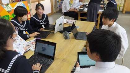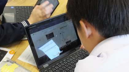 班で意見交換したり、Chromebookで調べたりしながら鑑賞しています。 -